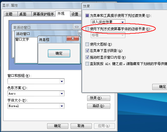 桌面右击选择“属性”-外观-效果-取消勾选“使用下列方式使屏幕字体的边缘平滑”